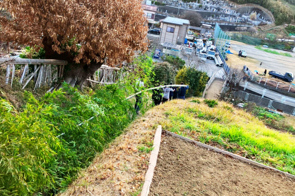 竹林から斎塔用の竹を伐採し、会場まで運び出します。