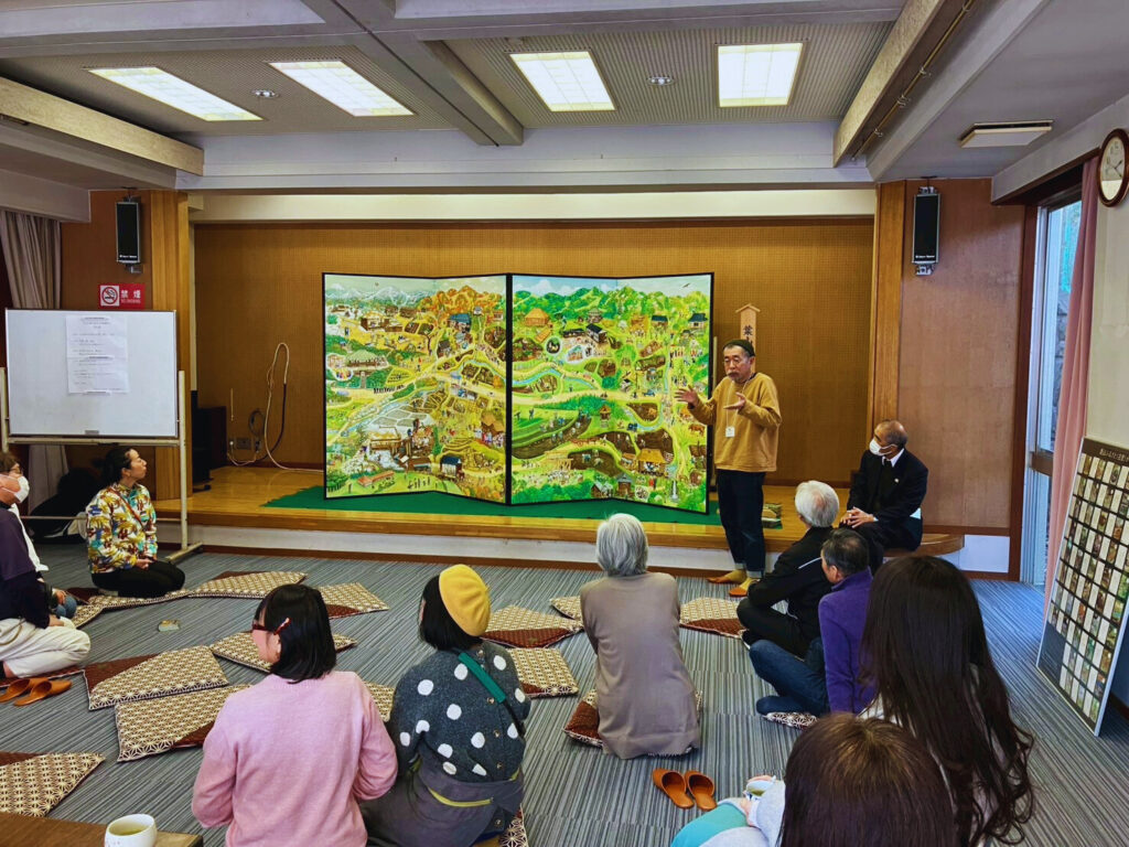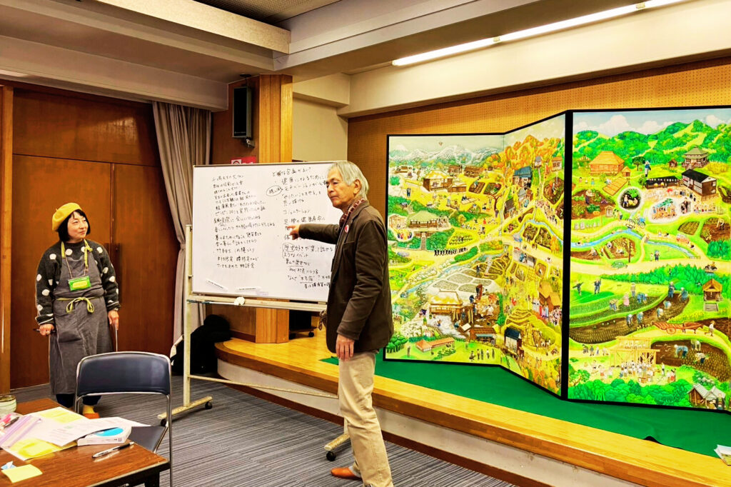 「葉山ふるさと絵屛風」は、地域の高齢者の記憶をもとに“心のふるさと”の風景を描いた作品です。のべ1,500人が関わり、3年をかけて制作され、