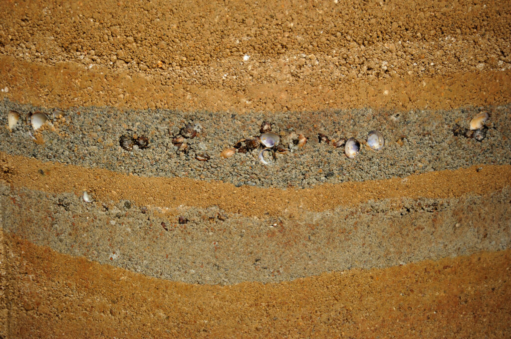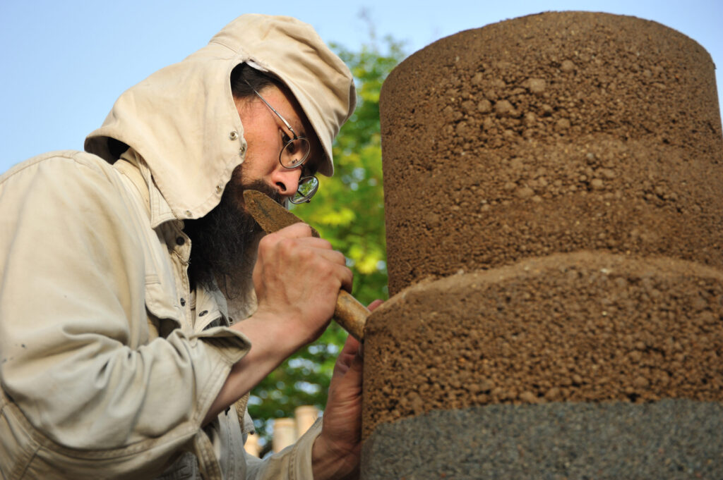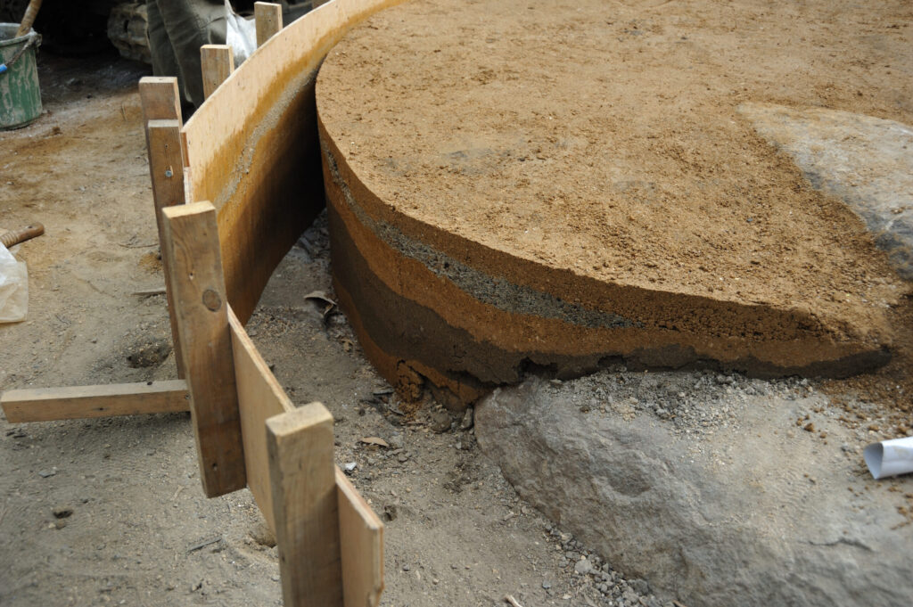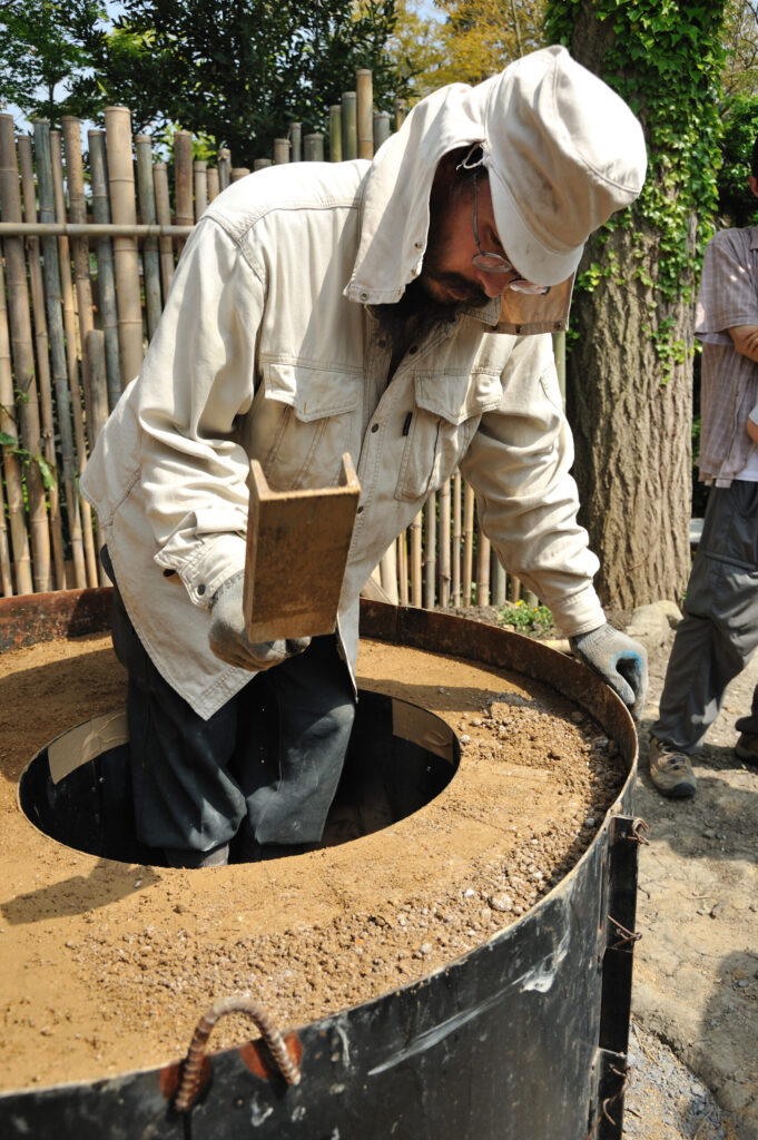 安達さんが特に力を注いでいるのが、昔ながらのかまどを現代の庭に再生した~かまどのあるあずま屋:版築くど楽庵~という提案です。これは、土を何層にも積み重ねながら固める版築(はんちく)工法によって造られたかまどで、その断面には地層のような美しい模様が浮かび上がります。