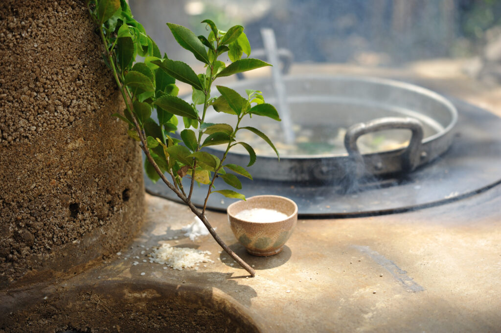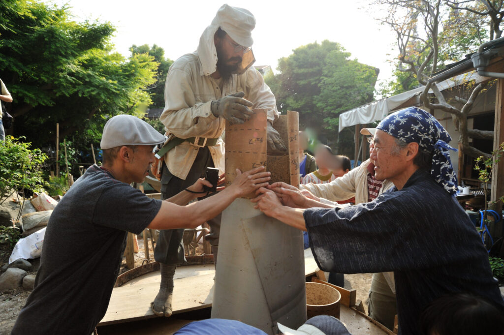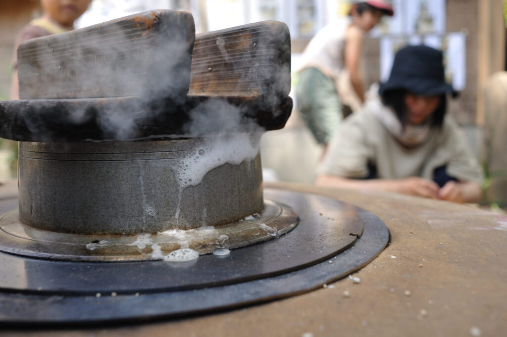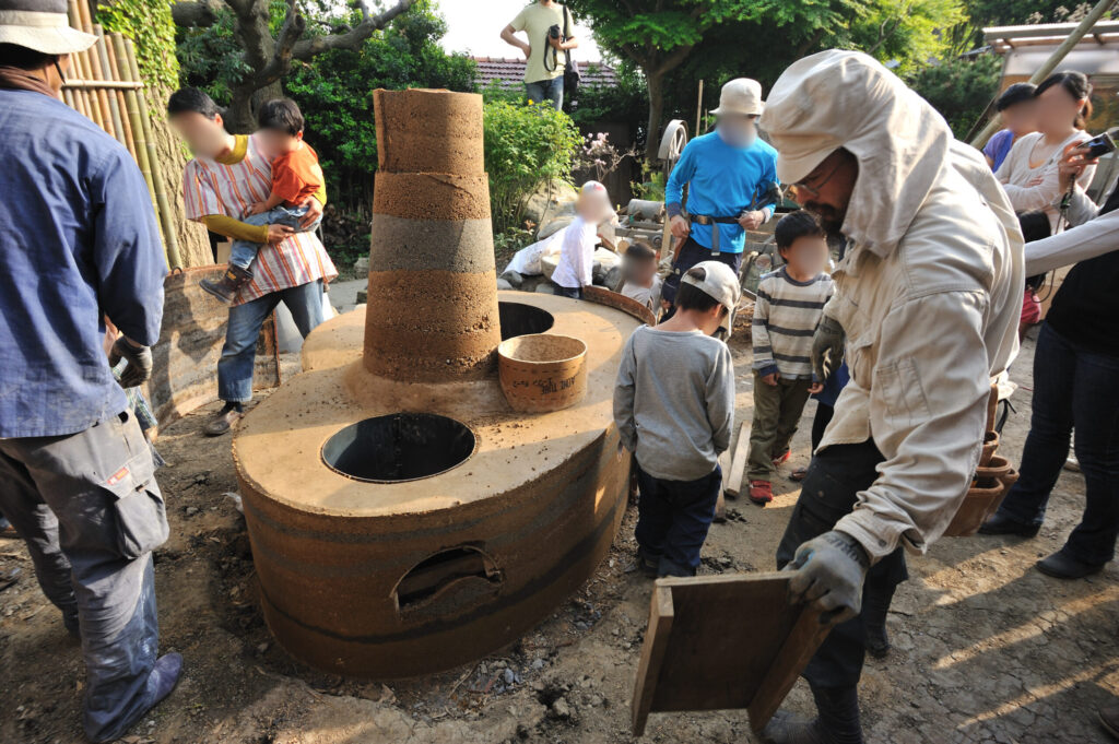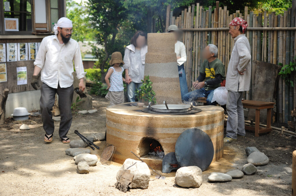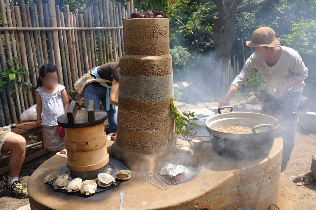 「くど楽庵」のアイディアについて伺うと、安達さんは 京都の桂離宮 を訪れた際の体験を語ってくださいました。池のまわりにお茶用と遊び用のあずま屋が点在し、遊び用のあずま屋は池に向かう土間が続く眺めの良いロケーションになっています。その魅力的な空間に感動し、ガーデンキッチンが人気の中でかまどを使った芋煮会やもちつきなどの遊びのある光景を思い描きました。そして、かまどを用いた『くど楽庵』が形になるまでに6年をかけて取り組みました。