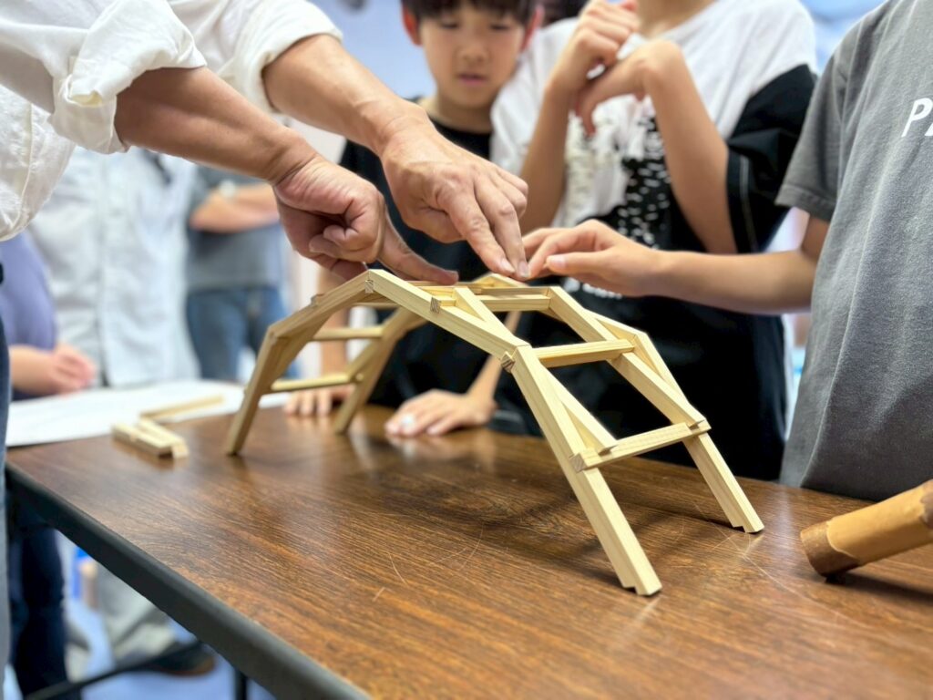 子どもたちが1年間にわたって、釘も接着剤も使わず、木材の重みと摩擦だけで支える “ダ・ヴィンチ橋” の技術を応用した橋を自ら組み上げ、完成後は地域の公園に常設遊具として設置する壮大な挑戦です。