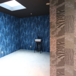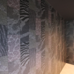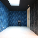 2階のサニタリーエリアは、深いブルーとグレーを基調にしご夫婦お二人のセンスが光るシックな空間。グレーの壁はアニマル柄、深いブルーの壁は木目をチョイス。ナチュラルテイストをアーティスティックに取り入れています。