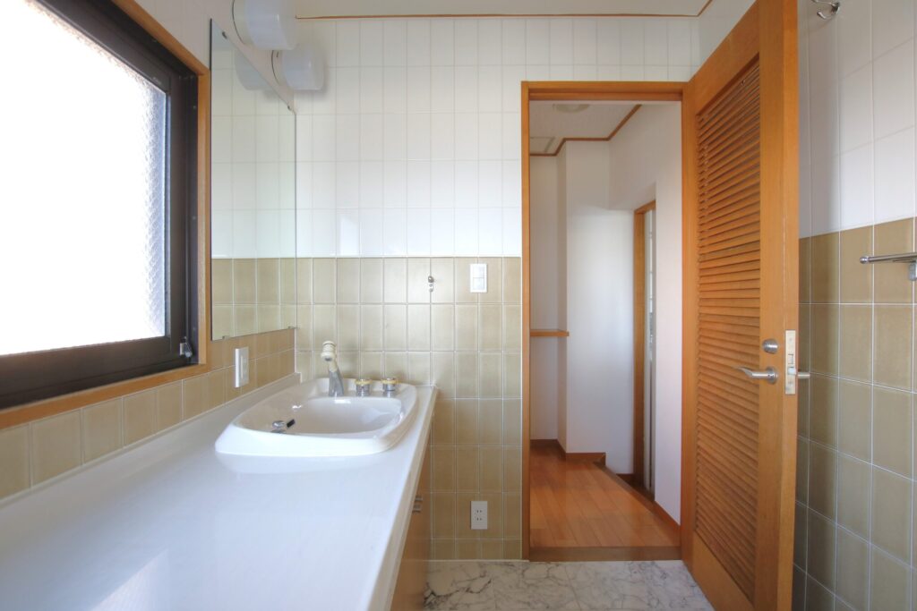 腰窓を塞ぎ、壁には幅いっぱいにLIXIL「ルミシス」の5面鏡を設置。タッチレスで点灯する縦ラインの照明が美しく、空間に上質な存在感を与えています。洗面台はTOTO「エスクア」を採用。見る角度によって表情が変わるクリスタルカウンターが、洗練された印象を際立たせています。