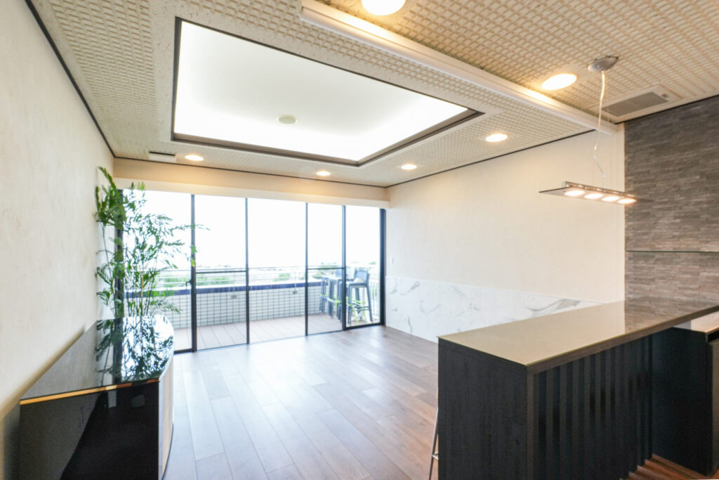最高の眺望が広がるリビングには、深みのある幅広の無垢フローリングを採用し、空間全体を引き締めながら上質感をプラスしています。