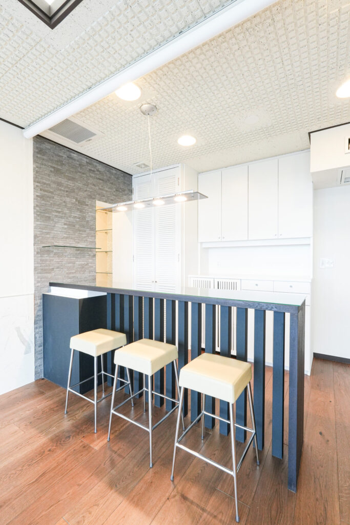 空間の主役となるバーカウンターは、施主様がデザインされた唯一無二の造作です。冷蔵庫を内蔵できるようサイズを綿密に設計し、無垢材に塗装を施しました。