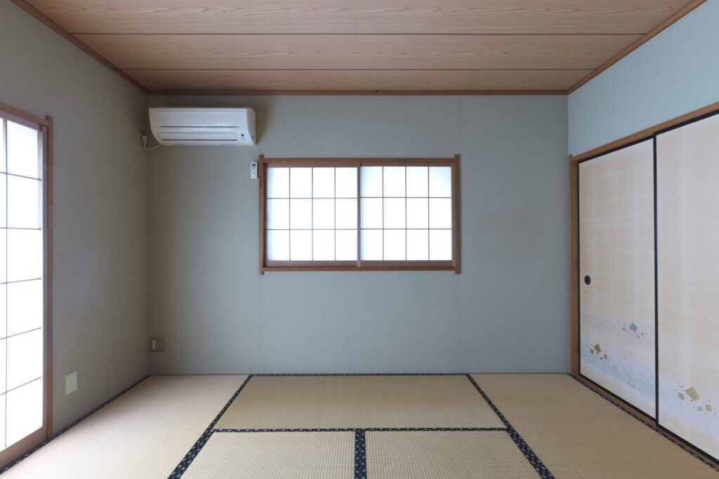 壁にはEM素材を含んだ珪藻土を塗布し、自然素材ならではの優しい質感に。襖も落ち着いたカラーでまとめ、空間全体がシックで上質な和の雰囲気に仕上がりました。