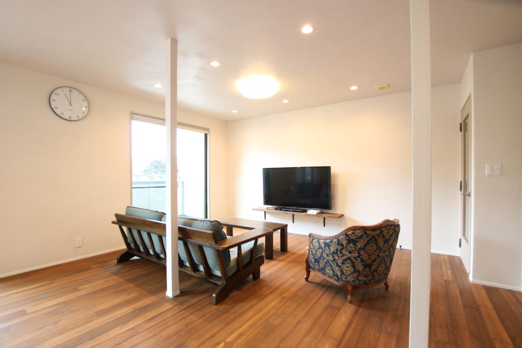 無垢材のフローリングとアンティーク家具が織りなす空間は、温かみと落ち着きを感じられるリビングに仕上がりました。