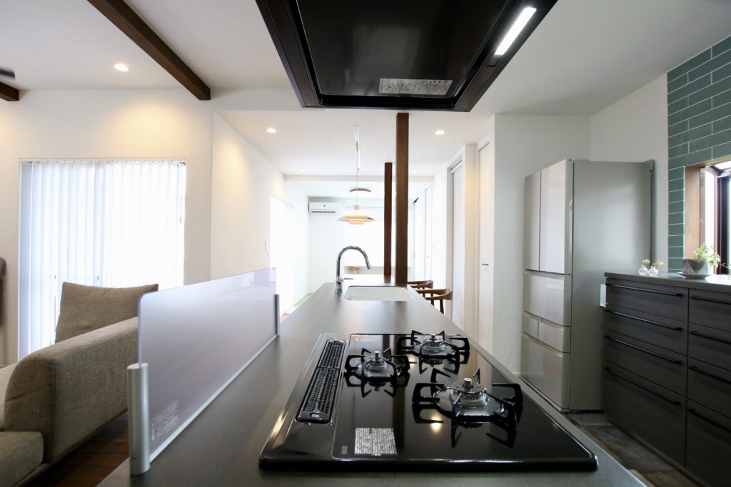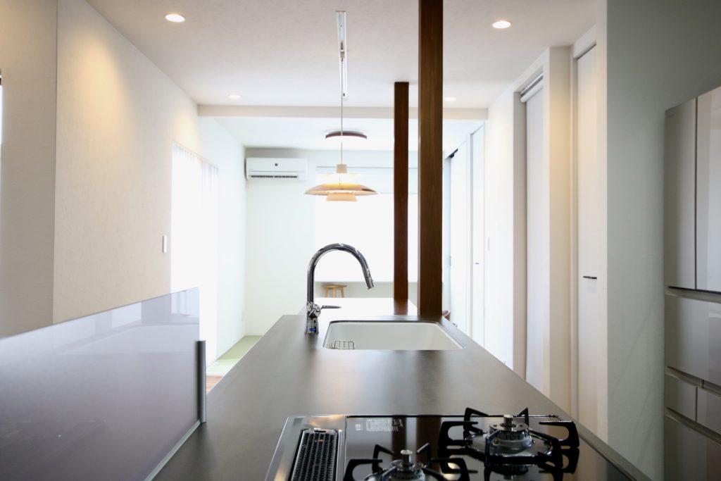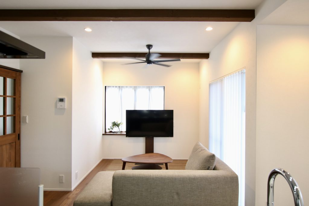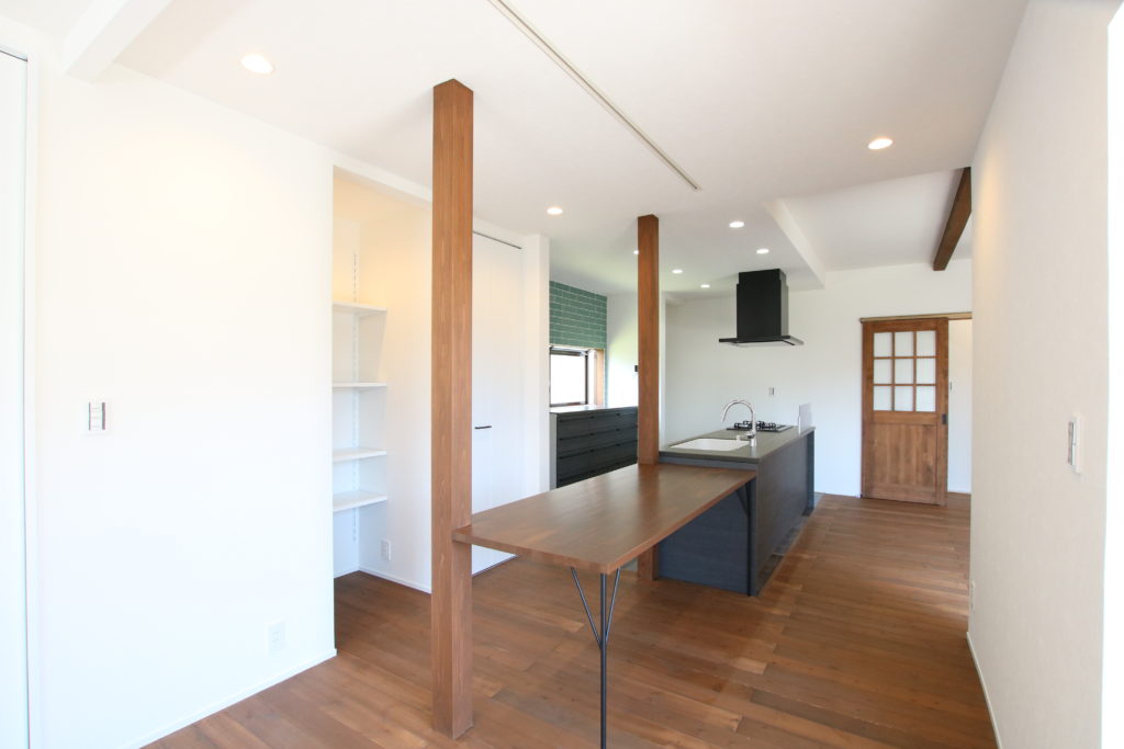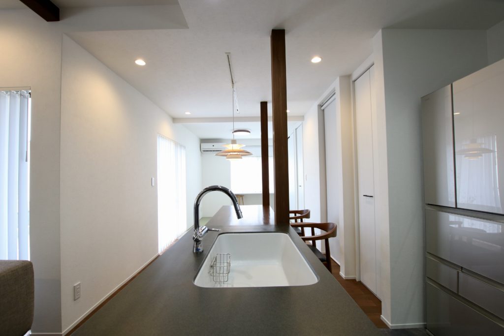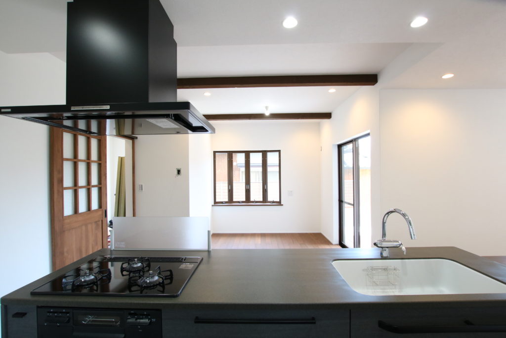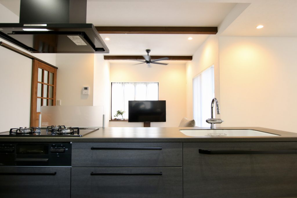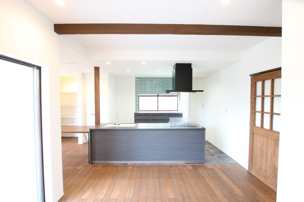 キッチンに立つと、明るいリビング全体を見渡せる間取りに生まれ変わりました。家族がどこにいても自然と気配を感じられる安心の空間です。天井は梁をあえて見せることでデザインのアクセントに。さらに高さを上げたことで、より広々とした開放感を演出しています。