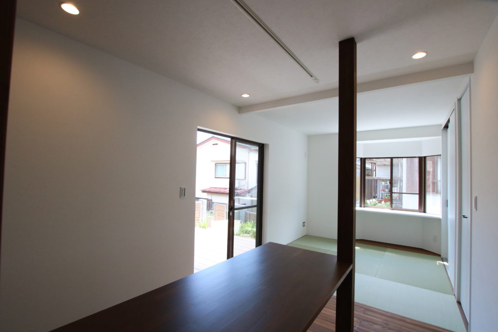 ダイニングの奥には4.5畳の畳スペースを設けました。ウッドデッキにつながる場所なので、窓を開ければ日向ぼっこにもぴったりです。無垢フローリングとつながることで、足にも優しく、温かみのある心地よい空間になっています。