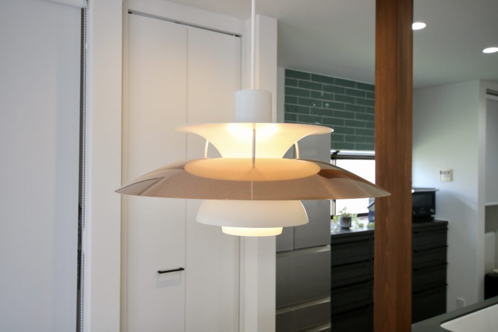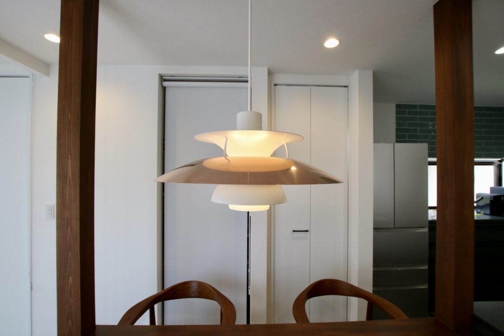 お部屋の中央には、縦に広がるキッチンとダイニングのスペースがあります。アイランド型なので、どこからでもアクセスでき、まるで家の中心のような存在です。構造的に抜くことができない柱を利用して、オリジナルで造作したダイニングテーブルの上には、ルイスポールセンのペンダントライトを配置し、空間全体がぐっと上質に引き締まります。