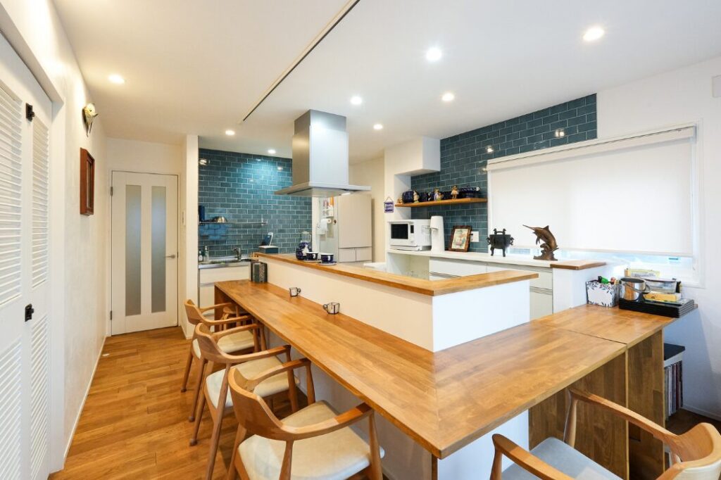 JR逗子駅から海側のA様宅のリノベーション。A様の楽しみはキャンプと、気の合う仲間たちとのホームパーティー。長年暮らしてきたこの家を、ライフスタイルに沿ってより快適にするお手伝いをさせていただきました。玄関を開けると暗めの廊下があったのですが、壁を取り払う事で生まれた大空間。また、もう一つの大きな特徴は外のウッドデッキからのアプローチする一室。こちらには部屋は掃き出しに土足OKのエリアと大きなシュークロークを作りもう一つの玄関としても活用できます。部屋自体も広くクローゼットと棚も大きくご用意しアウトドアの道具の収納も容易です。床材は無垢のパイン材、キッチン周りも深いブルーを選び、シックで落ち着く1階フロアは、大人数の来客でも楽しい一時を過ごせると思います。2階は、4つあった部屋の2つを繋ぎ大きな空間にしています。また、元々一階にあった洗濯機は2階のランドリールームを用意し移動。お子様の部屋は、かわいいターコイズブルーの壁に仕上げています。